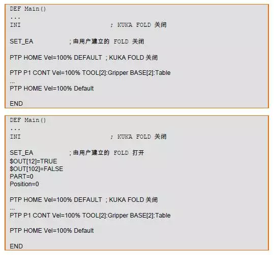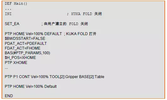 除此之外,用戶(專家用戶組以上)還可以創(chuàng)建自己的 Fold。這些 Fold 例如可以由程序員使用,使用時雖然可以通知操作人員在程序的一定位置處發(fā)生的事件,但在后臺仍保持實(shí)際的 KRL 句法。Fold 通常在創(chuàng)建后首先顯示成關(guān)閉狀態(tài)。